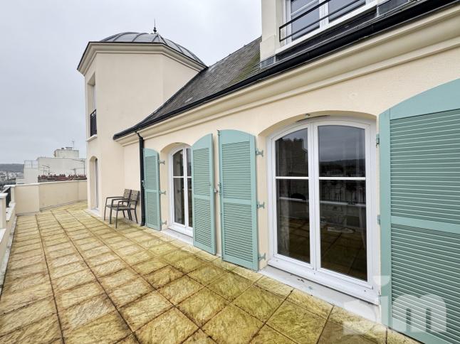 Magnifique 5 pièces duplex, une pièce à vivre de 40 m², cuisine équipée qualitée, le tout ouvrant sur terrasse de 43 m², wc avec coin buanderie, rangements, à l étage 2 chambres avec penderies, une suite avec salle d eau privative, wc, une autre salle d eau, une cave, un garage double, la gare à 5 minutes, dans une résidence standing ravalée, LOGEMENT D EXCEPTION